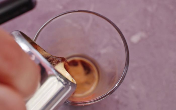 Einen Espresso in eine Tasse oder ein Wasserglas geben.